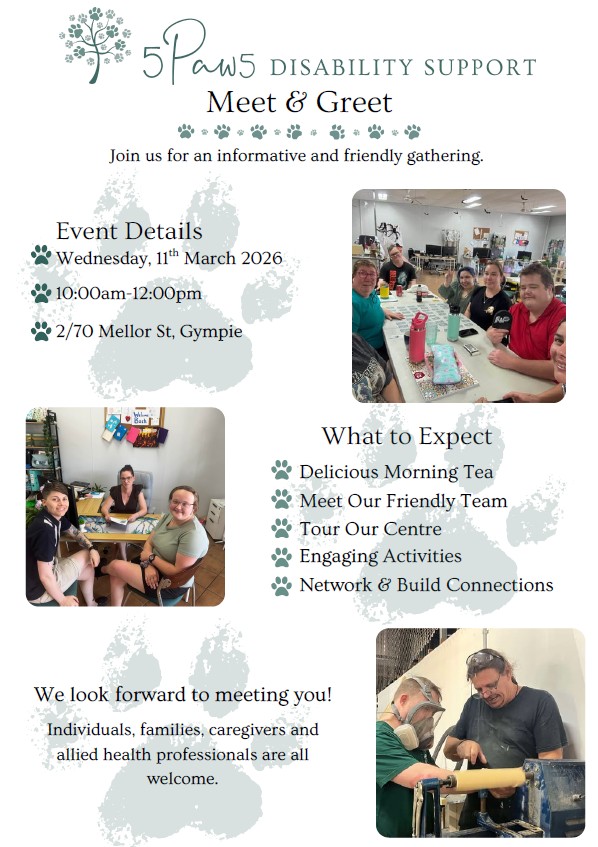 Discover what makes our centre unique on Wednesday 11 March, from 10am to 12pm at 2/70 Mellor Street, Gympie. Meet our friendly team, tour our facilities, and participate in interactive activities. Enjoy a delicious morning tea with an array of treats. This is also the perfect opportunity to network and connect with our vibrant community. RSVPing isn’t necessary but appreciated �� For further details you can reach out to us at 0489 082 555 or email info@5paw5disabilitysupport.com We look forward to seeing you there!