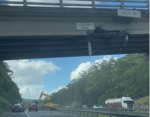 The Ilkley Road overpass remains closed at Tanawha after a truck carrying an excavator struck the bridge on the Bruce Highway on Friday.